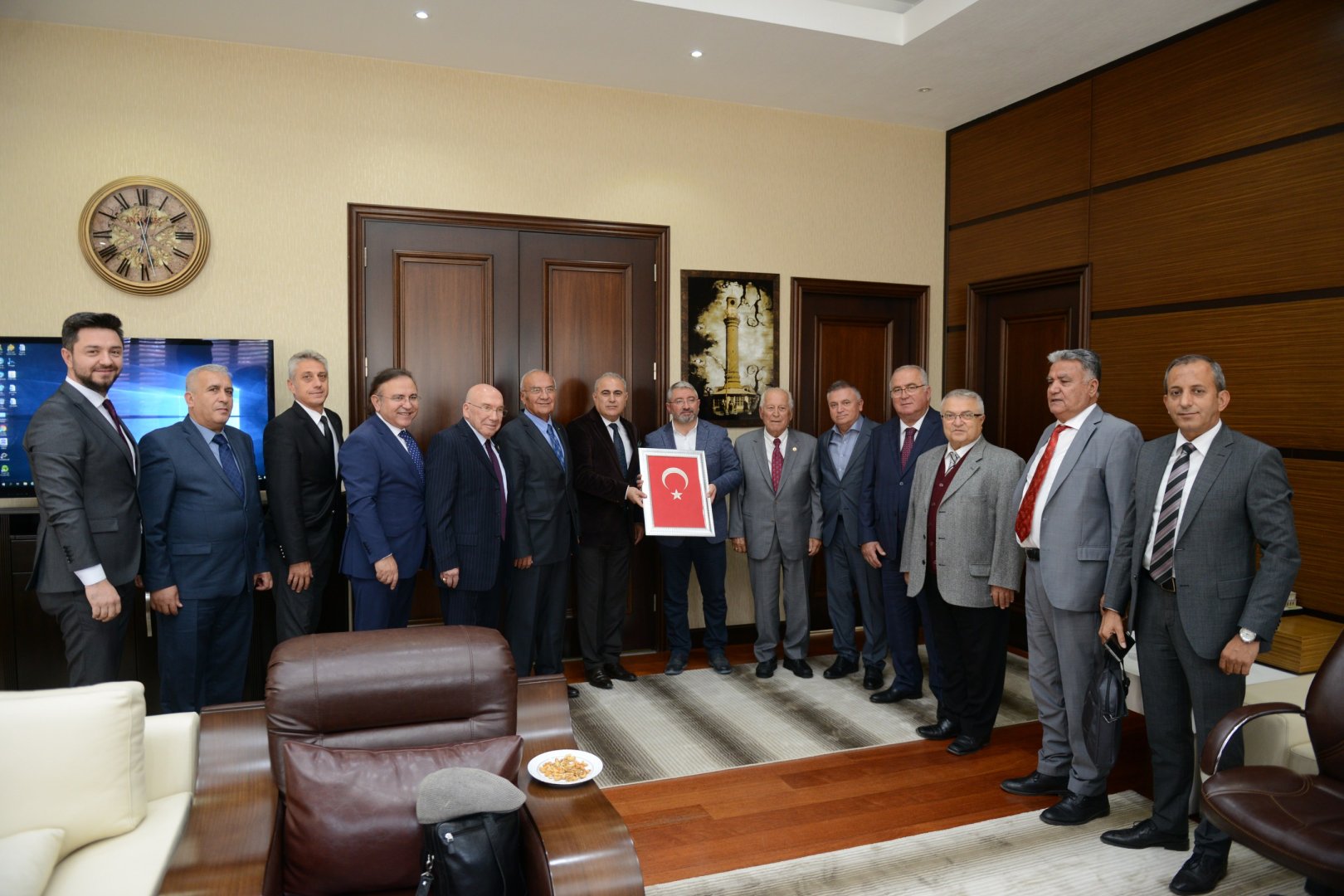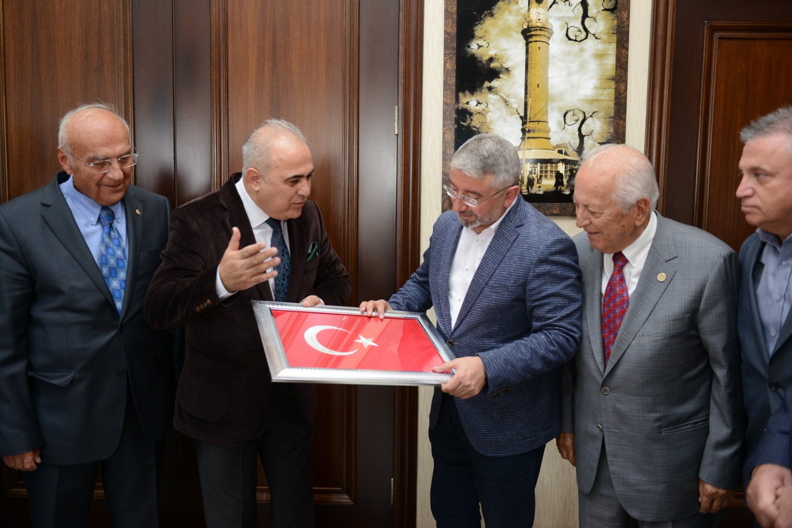 Ziyarette Vakıf 19 heyeti Belediye Başkanı Aşgın’a özel yapım Türk Bayrağı hediye etti.