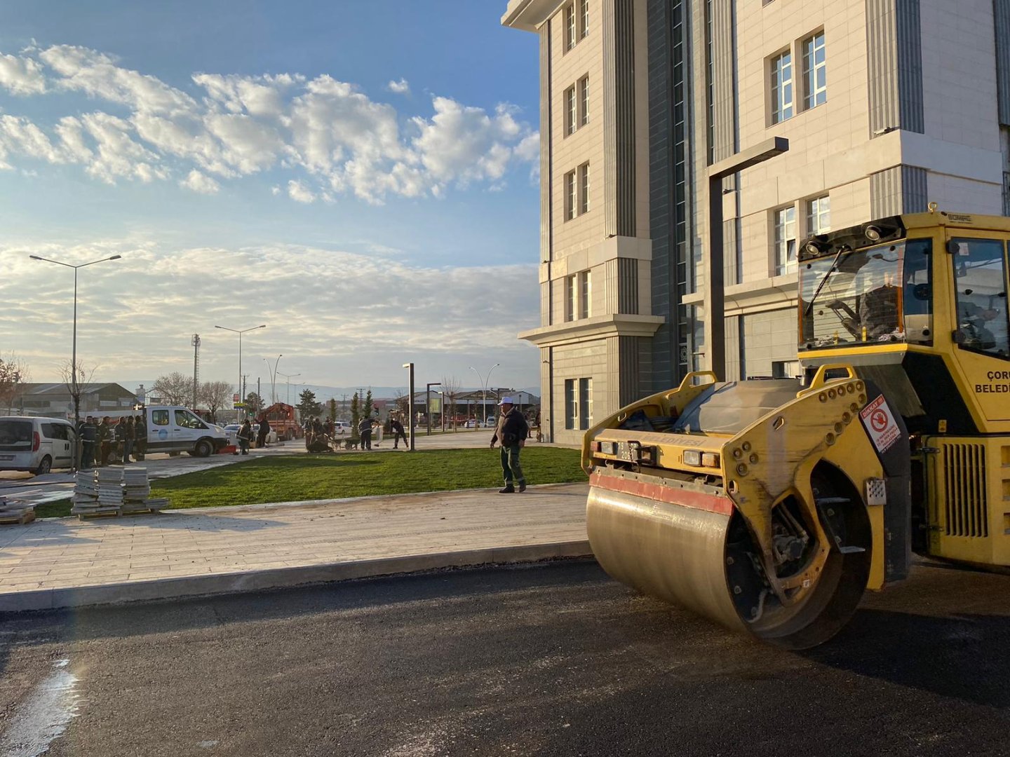 Çorum Belediyesi tarafından yaptırılan yeni belediye hizmet binasında çevre düzenlemesi ve peyzaj çalışmaları büyük bir hızla devam ediyor.
