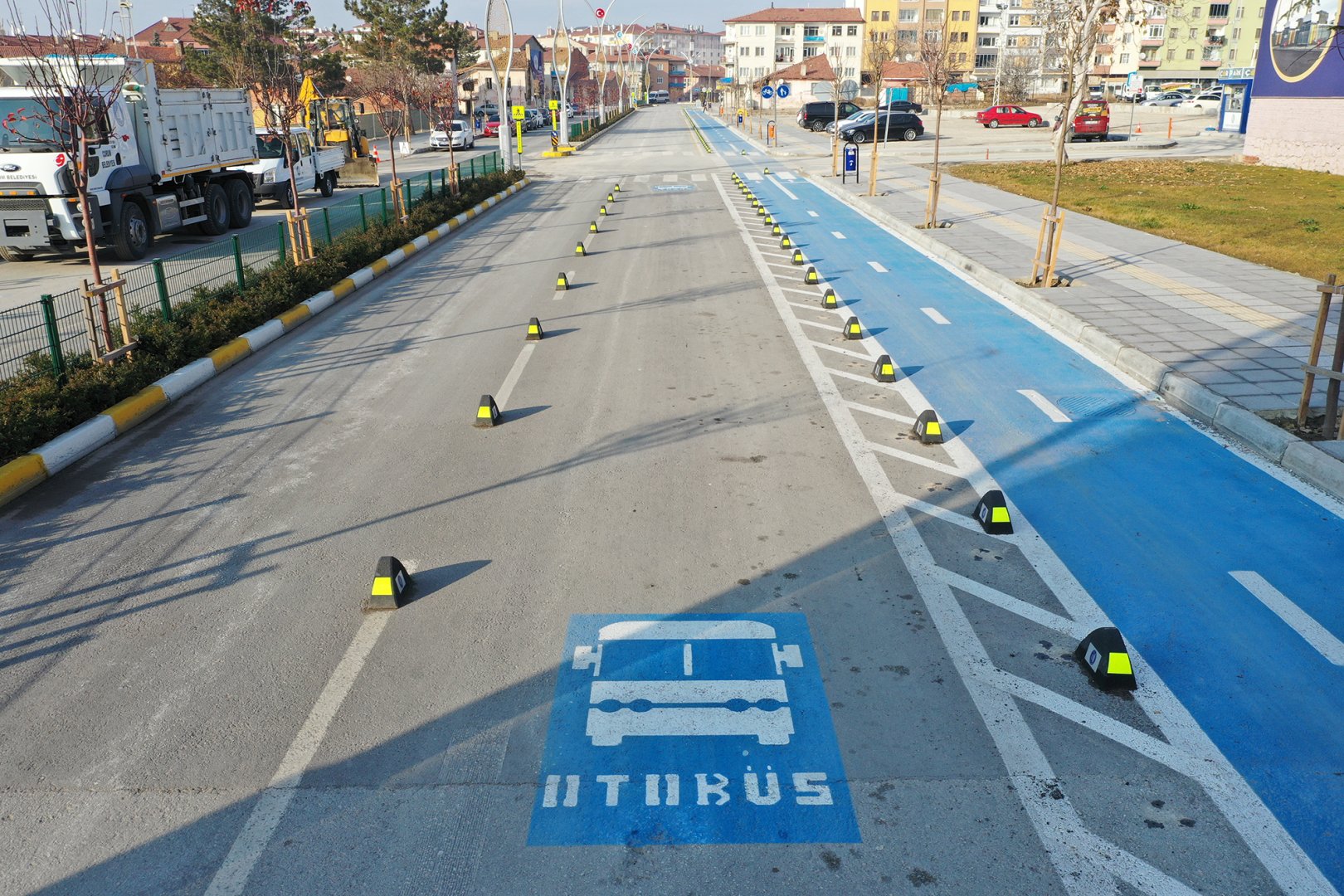Trafiğin daha düzenli ve akıcı olması için büyükşehirlerde kullanılan uygulamaya benzer bir uygulama ile otobüsler için ayrı şerit belirlediklerini kaydeden Başkan Yardımcımız Lemzi Çöplü, “Buraya girerken Recep Tayyip Erdoğan Caddesinden geçişlerle ilgili olarak biz hem bisiklet yolu yanında da otobüs yolu olarak düşündüğümüz bir alan belirledik. Büyükşehirlerde tramvay hattı, otobüs hattı olarak kullanılan özel bir alan gibi biz de burada bir alan ayırmış olduk. Otobüslerin burada trafiği tıkamadan giriş yaparak yolcusunu aldıktan sonra tekrar Gazi Caddesine katılımı sağlaması amacıyla 50 metrelik bir alanda yolu ikiye bölmüş olduk.” şeklinde konuştu.